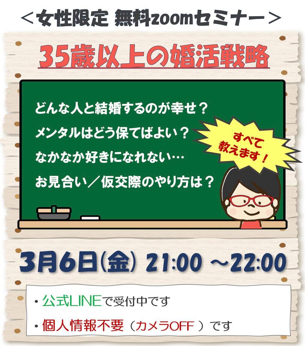公式LINE特典の『35歳以上の婚活戦略』をもっと知りたい!というご要望にお応えして、婚活セミナーを開催いたします!