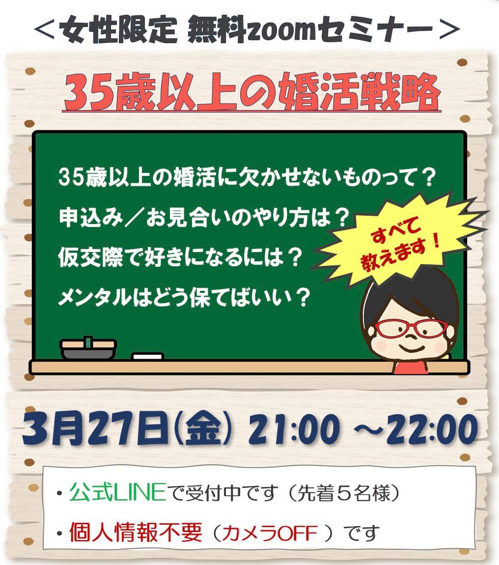 公式LINE特典の『35歳以上の婚活戦略』をもっと知りたい!というご要望にお応えして、婚活セミナーを開催いたします!