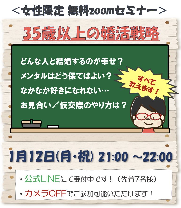 【35歳以上の婚活戦略】無料zoom婚活セミナー開催!<1/12(月/祝)21時〜>*終了しました*